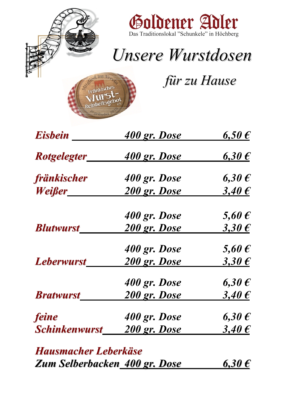 Jede Woche stellen wir hauseigene Wurst her. Nicht nur in Dosen, sondern auch als Frischware verkaufen wir diese am „Hintereingang“. Mittwochs zum Schlachttag werden Blut- und Leberwurst gemacht, am Donnerstag dann die Brühwurstsorten. Unser komplettes Sortiment ist frei von Hefeextrakten und Geschmacksverstärkern, und wird streng nach den Vorgaben vom “ Fränkisches Wurst- Reinheitsgebot e.V.“ gemacht.